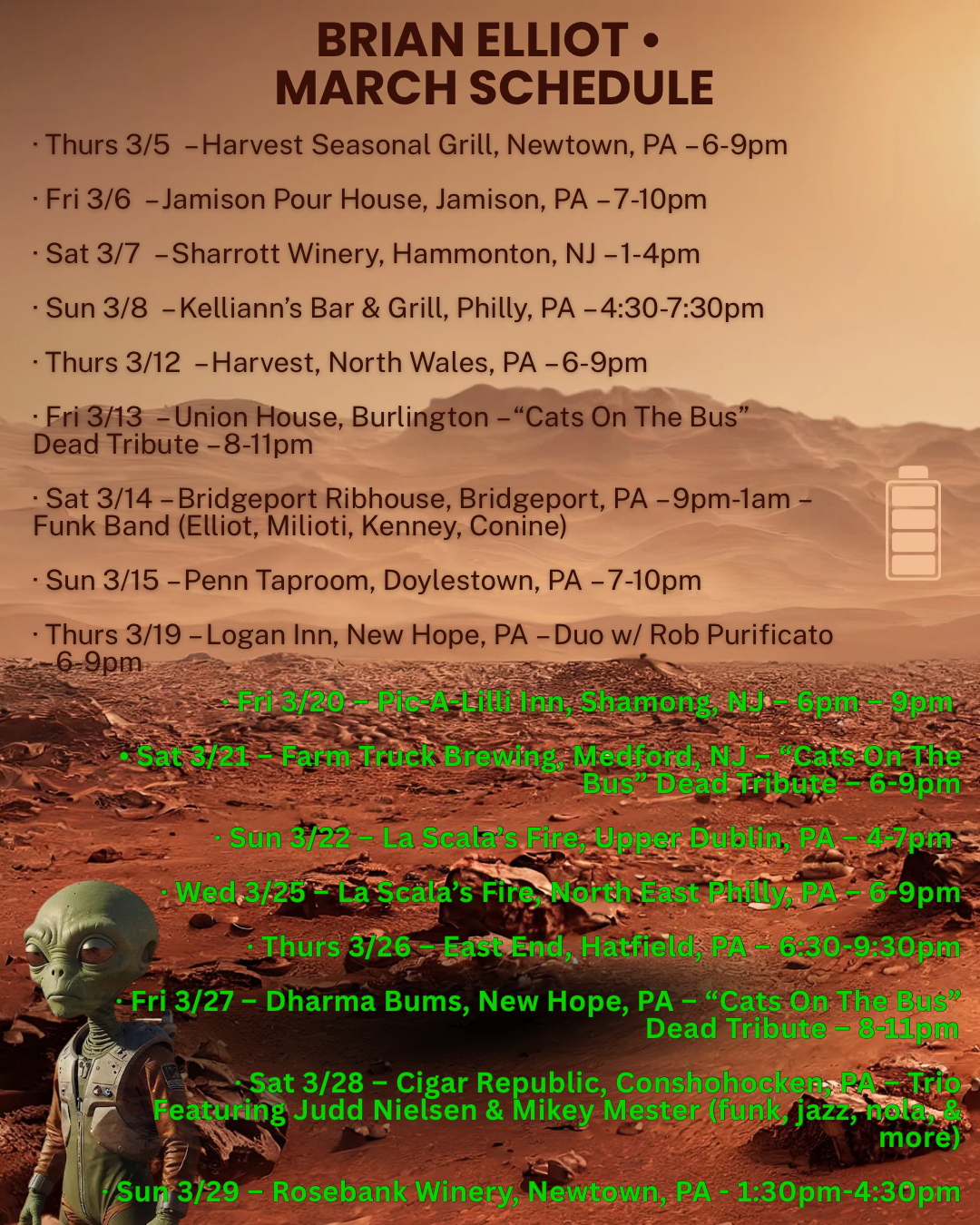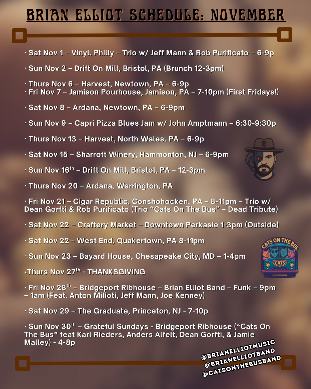 I saw Brian Elliott for the first time at the Continental Tavern in Yardley. Not only is this young man extremely talented, with strong vocals and guitar skill, he's a genuine soul. No ego here! It's all about the music! I will definitely make it a point to see him again. You should, too!